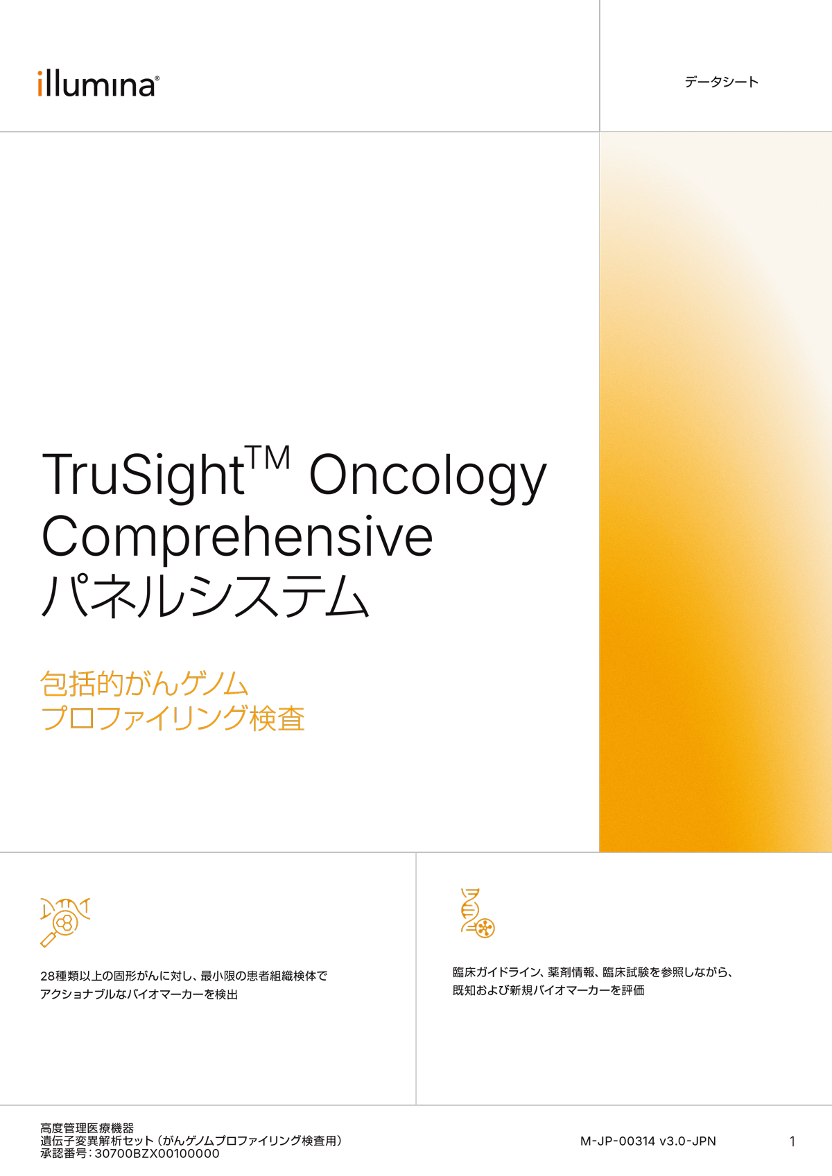 TruSight Oncology(TSO)Comprehensive パネルシステムは、固形がん患者のホルマリン固定パラフィン包埋(FFPE)サンプルを用いて、一回の検査で517の固形がん関連遺伝子変異を包括的に検出するがん遺伝子パネル検査です。DNAからは一塩基変異(SNV)、多塩基変異(MNV)、挿入・欠失(Indel)および遺伝子増幅(Gene amplification)を、RNAからは既知と新規の融合遺伝子(Fusion)およびスプライスバリアント(Splice Variant)を検出します。