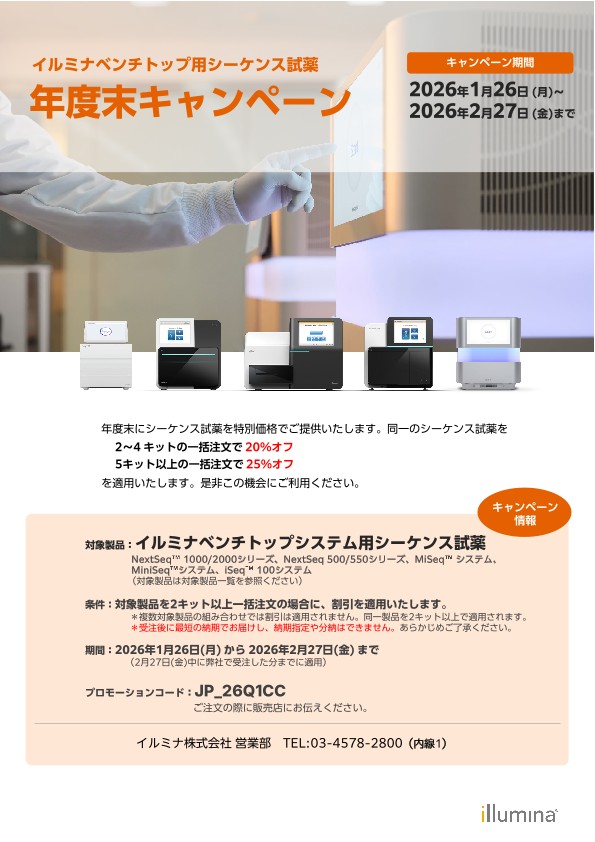 対象製品 NetSeq™ 1000/2000シリーズ、NextSeq 500/550シリーズ、MiSeq™ システム、MiniSeq™ システム、iSeq™ システム ※ 詳細はPDFをご覧ください。