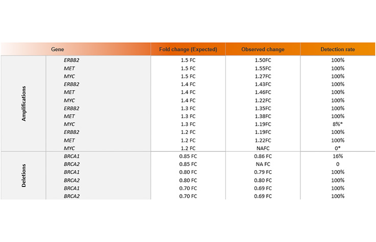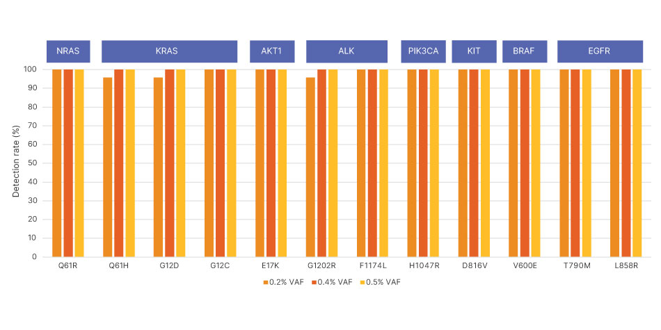 90%超の感度と95%超の特異性で、SNVに対して約0.2%のVAF検出を達成するには、約20 ngのcfDNAインプットが推奨されます。ただし、アッセイが受容可能なcfDNAのインプット範囲は10~30 ngです。