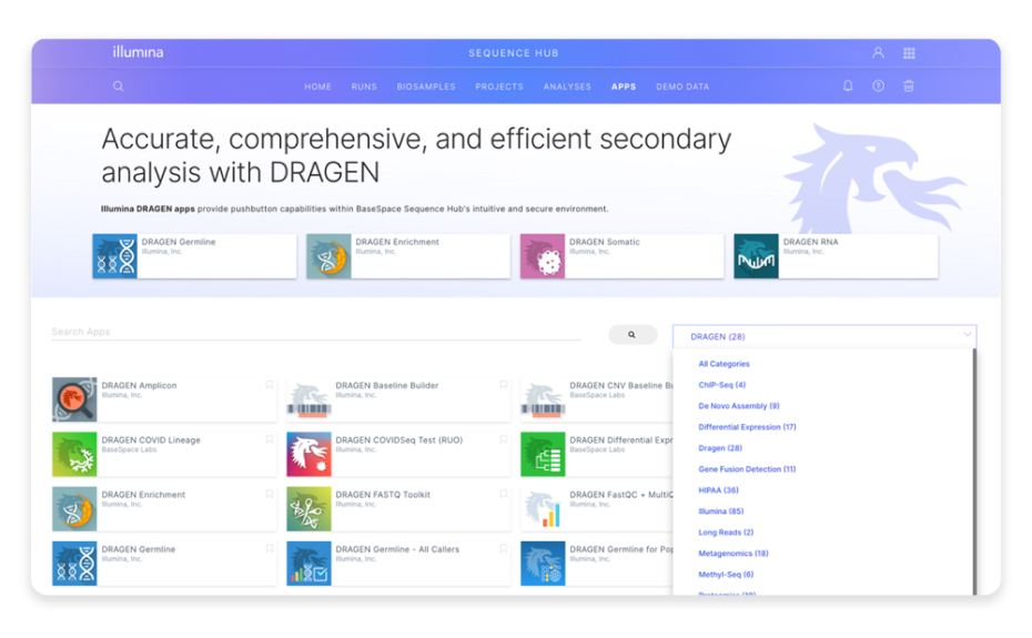 DRAGEN二次解析は、幅広いゲノム解析機能のためのアプリケーションとパイプラインを提供します。DRAGENアプリは、BaseSpace Sequence Hub上のクラウドで、正確かつ効率的でセキュアな解析を提供します。DRAGENパイプラインは、オンプレミスサーバー、Illumina Connected Analytics上のクラウド、またはNovaSeq Xシリーズ、NextSeq 1000およびNextSeq 2000システム、MiSeq i100シリーズのオンボードで起動できるデータ解析ツールです。