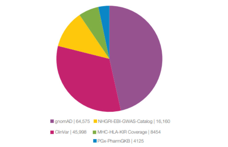 v3.0の臨床研究コンテンツには、確立された疾患関連、関連するファーマコゲノミクスマーカー、およびClinVar、NHGRI、PharmGKB、およびExACデータベースから派生したキュレーションされたエクソンコンテンツを持つバリアントが含まれます。