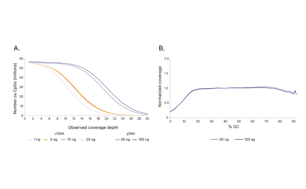 Illumina 5-Base DNA Prepを使用して、(A) シトシン-グアニンジヌクレオチド(CpG)の高いカバレッジ、(B) 幅広いGC含量で均一なカバレッジを実現します。インプット量は、健康なドナーからのcfDNAで1~20ng、ヒトリファレンスサンプルNA12878からのgDNAで50~100ngです。