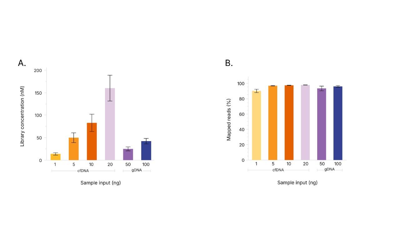 Illumina 5-Base DNA Prepを使用した健康なドナーからのcfDNAインプット1~20ngおよびヒトリファレンスサンプルNA12878からのgDNAインプット50~100ngに対する(A) ライブラリー収量および(B)アライメント率(マップリードの割合)。