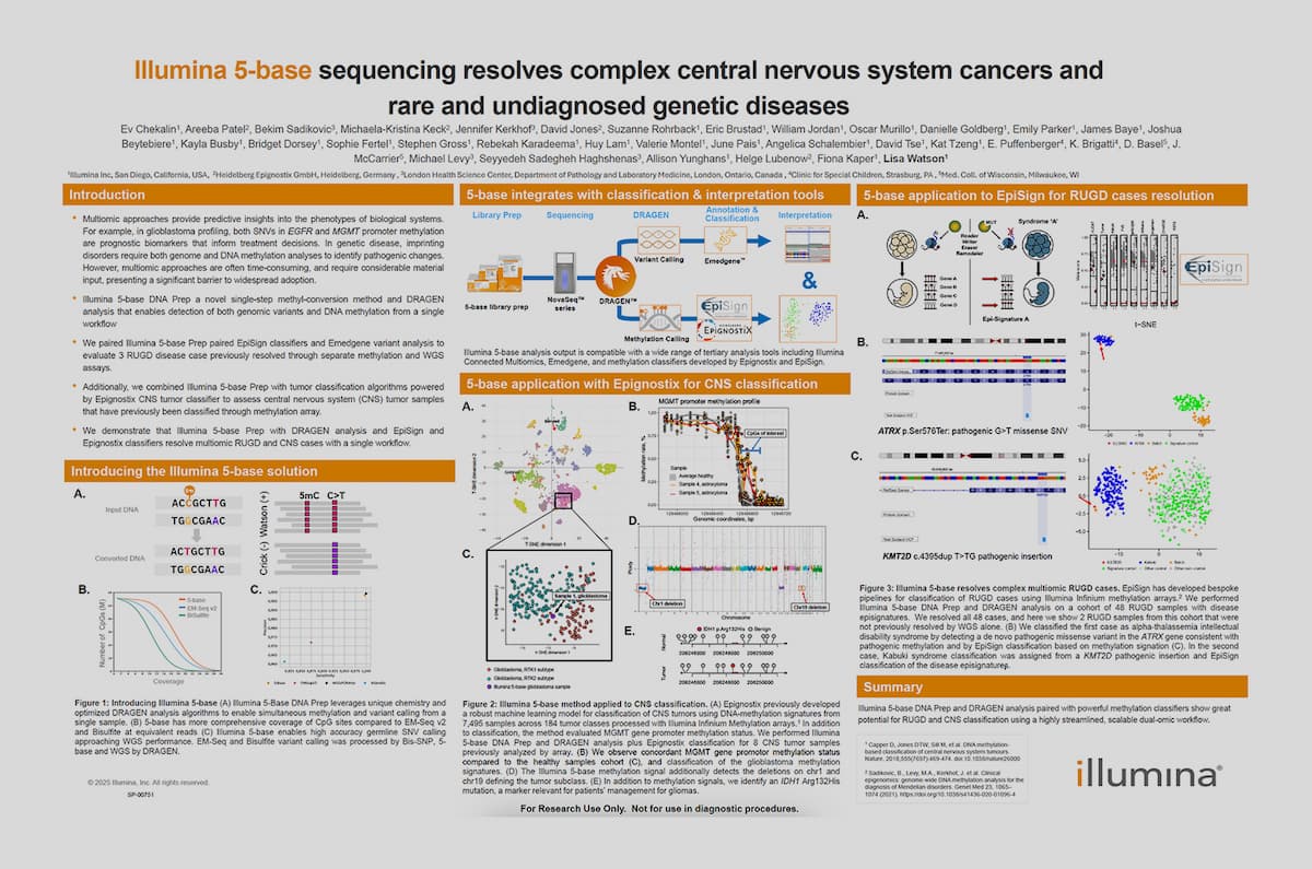 このポスターでは、イルミナの5塩基シーケンシングが、1つの合理化されたワークフローからゲノムバリアントとDNAメチル化の同時検出をどのように可能にするか解説します。これにより、このデュアルオミクスアプローチのパワーを発揮して、複雑な中枢神経系腫瘍や希少または未診断の遺伝性疾患をさらに高い精度と効率性で解明します。